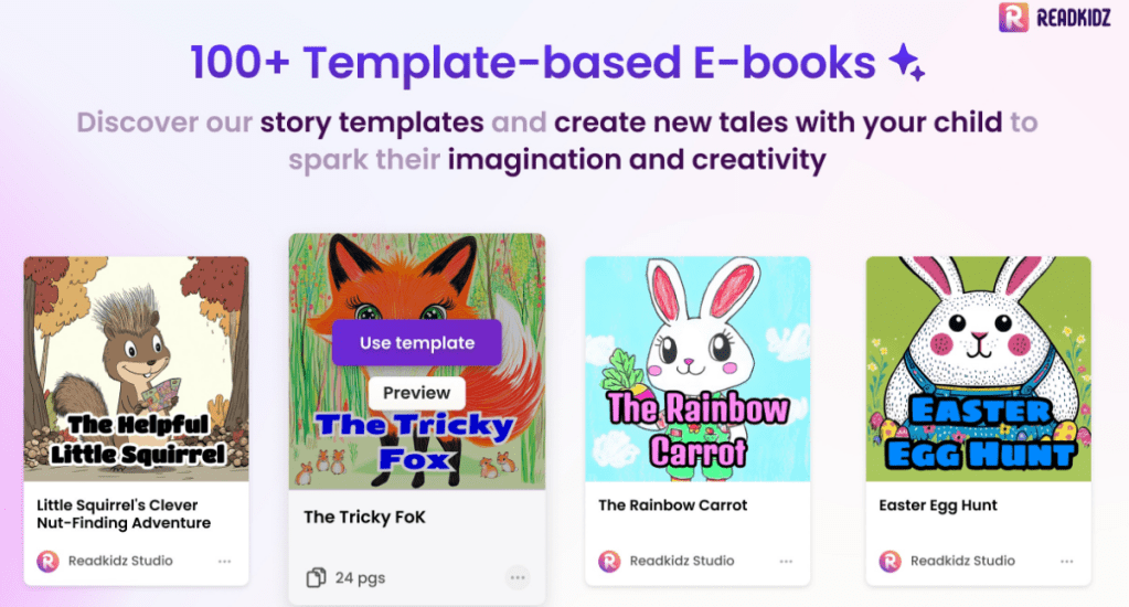 - Easy Media Export & Format Conversion: From interactive e-books and printable PDFs to story videos with auto-generated music, ReadKidz adapts your project to the format that fits your needs.