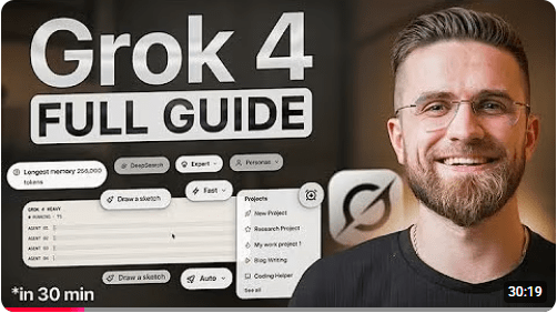 This video, titled “Ultimate GROK 4 Guide 2025: How to Use GROK for Beginners” by AI Master, introduces Grok 4 and explains how to set it up, customize its modes—Auto, Fast, Expert, and Heavy—and write effective prompts. It also demonstrates advanced features such as real-time web search, code execution, voice and vision capabilities, and organizing work with Personas, Memory, and Workspaces. Toward the end, it covers Grok’s multi-agent mode and compares Grok with GPT-5, helping viewers understand when to use each option.